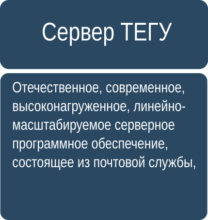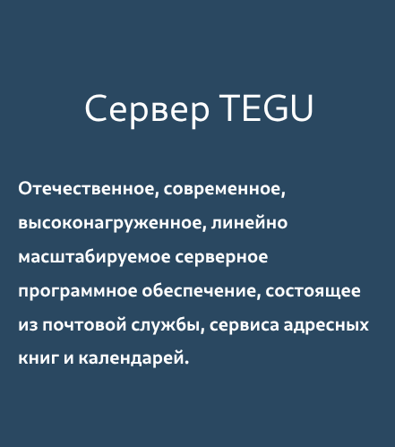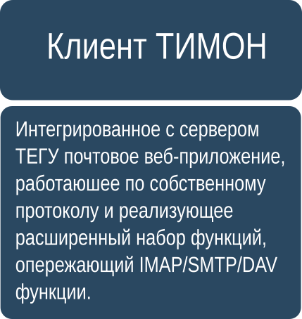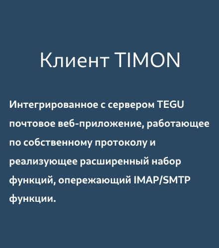 Интегрированное с сервером TEGU почтовое веб-приложение, работающее по собственному протоколу и реализующее расширенный набор функций, опережающий IMAP/SMTP функции.